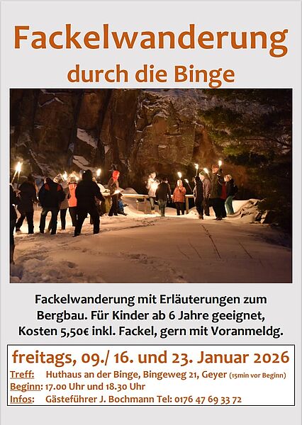 Die Fackeltour führt um und durch das Wahrzeichen der Stadt Geyer - die Binge. Gästeführer J. Bochmann erläutert den Bergbau im ehemaligen Geyersberg anhand von Bildern und Karten. Die Runde ist für Kinder ab 6 Jahre gut geeignet, Kosten 5,50€ , inkl.Fackel. Nach der Tour können Sie individuell den Abend im Huthaus (Tel. 037346 6524) bei guter erzgebirgischer Küche ausklingen lassen.